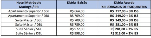 Informações: Tarifas com preços especiais ao participante do evento deve ser feito unica e exclusivamente com o hotel através dos telefones (44) 3221-8100, (44) 98433-0410 WhatsApp ou e-mail: reservas@hotelmetropolemaringa.com.br
