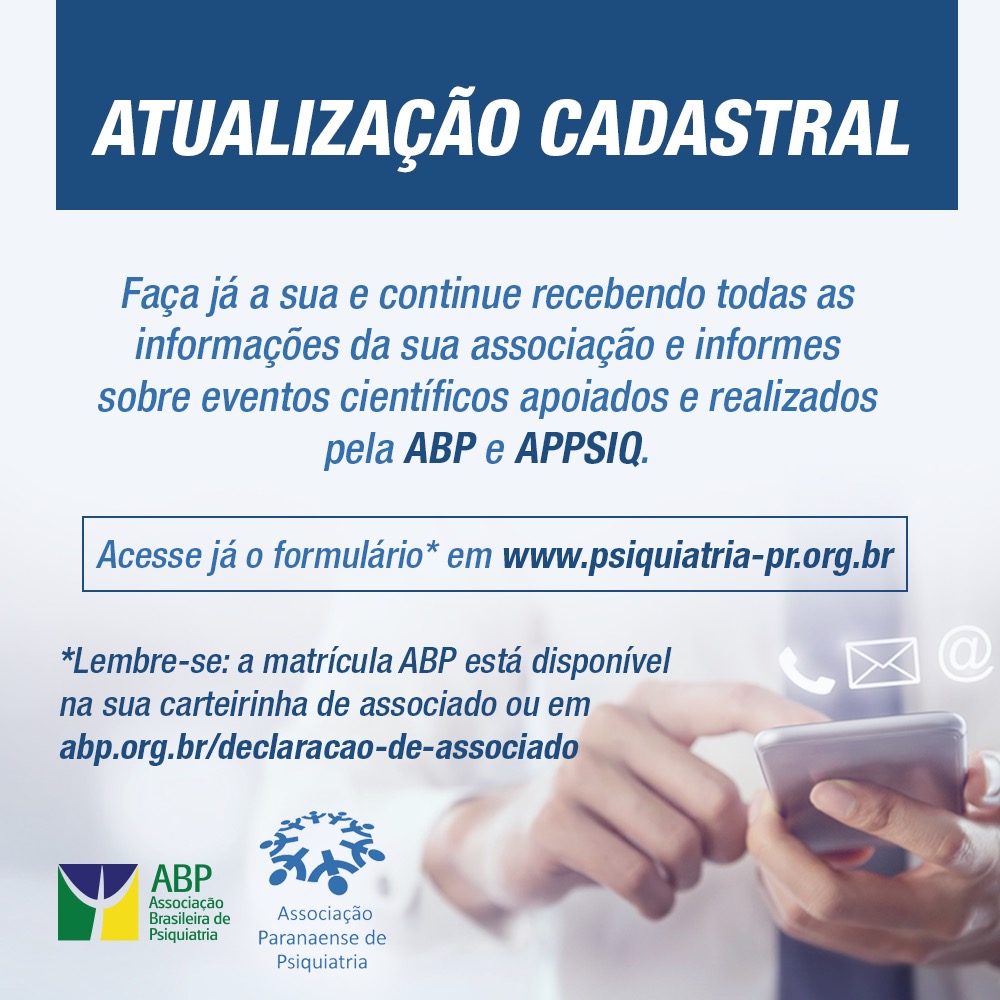 É de extrema importância termos seu cadastro atualizado, através dele, o manteremos sempre informado sobre os eventos científicos apoiados e realizados pela ABP e APPSIQ, bem como Cursos, Simpósios, Pré Jornadas e Jornada Paranaense de Psiquiatria.