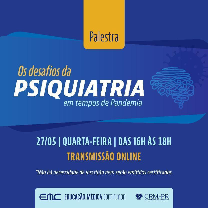 O projeto de Educação Médica Continuada do Conselho Regional de Medicina do Paraná (CRM-PR) promove na próxima quarta-feira, 27 de maio, às 16h, a palestra "Os desafios da Psiquiatria em tempos de pandemia", que será ministrada pelo presidente da Associação Paranaense de Psiquiatria (APPSIQ), Dr. Júlio Cesar Nogueira Dutra (CRM-PR 23.435). O evento é voltado para médicos, estudantes de Medicina e demais interessados e será transmitido somente pela página do Conselho no YouTube.