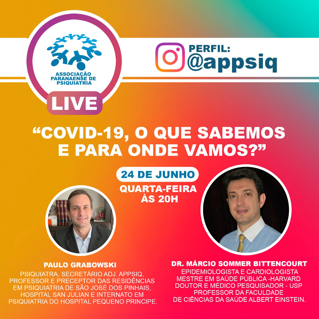 Os convidados especiais da semana, Dr. Paulo Grabowski (secretário adj. da APPSIQ) e Dr. Márcio Sommer Bittencourt (epidemiologista e cardiologista USP), irão discutir sobre o tema: "COVID-19, O QUE SABEMOS E PARA ONDE VAMOS?", e eles esperam por Você!