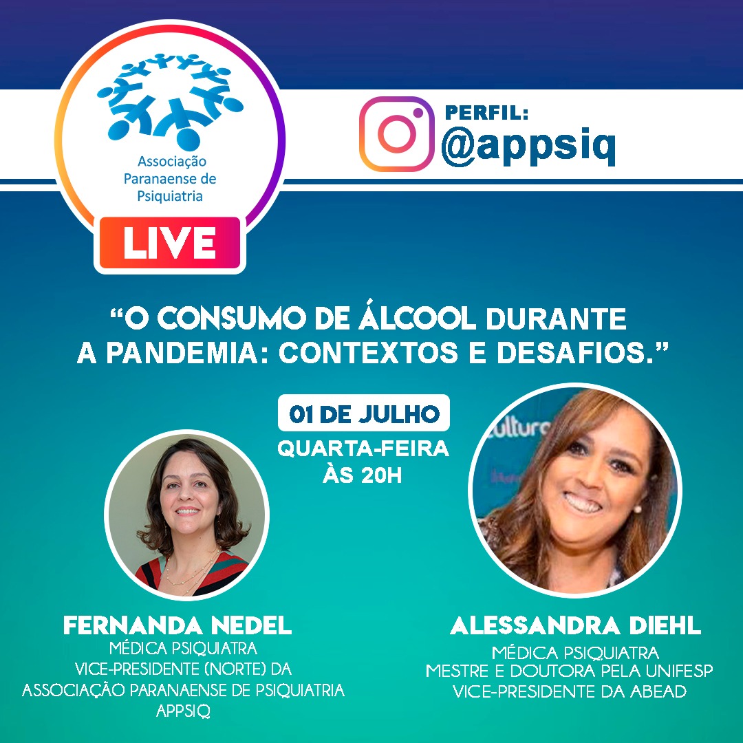 As convidadas especiais dessa semana, Dra. Fernanda Nedel (psiquiatra, e vice-presidente norte APPSIQ) e Dra. Alessandra Diehl (psiquiatra, mestre e doutora pela UNIFESP), irão debater sobre o tema: "O CONSUMO DE ÁLCOOL DURANTE A PANDEMIA: CONTEXTOS E DESAFIOS"