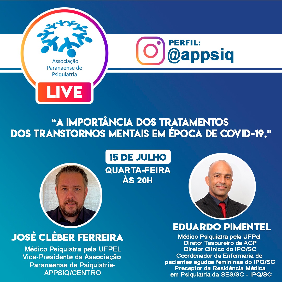 Os convidados especiais dessa semana, Dr. Eduardo Pimentel (psiquiatra, preceptor da residência médica em psiquiatria da SES/SC - IPQ/SC) e Dr. José Cléber Ferreira (psiquiatra, vice-presidente APPSIQ - centro), irão debater sobre o tema: "A IMPORTÂNCIA DOS TRATAMENTOS DOS TRANSTORNOS MENTAIS EM ÉPOCA DE COVID-19.”