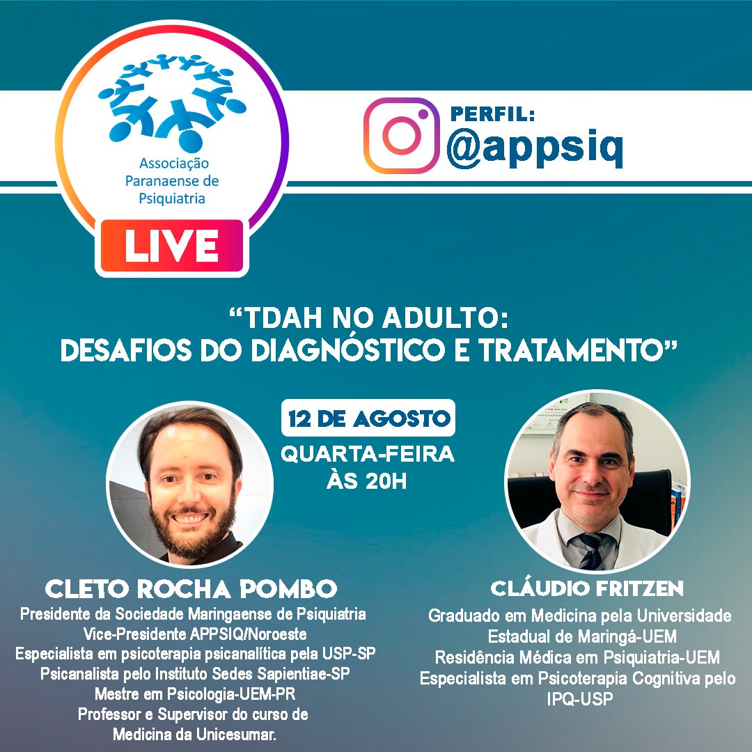 Nessa quarta-feira dia 12/08 às 20h, a Associação Paranaense de Psiquiatria - APPSIQ dando sequência em seu projeto "Série de Lives" irá apresentar sua décima Live.