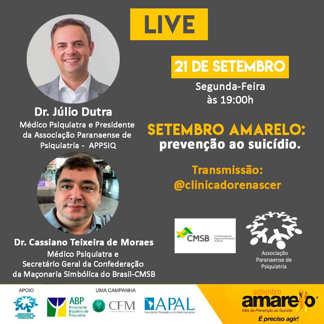 A Associação Paranaense de Psiquiatria - APPSIQ, em parceria com a Confederação da Maçonaria Simbólica do Brasil - CMSB, irão apresentar LIVE HOJE às 19h.