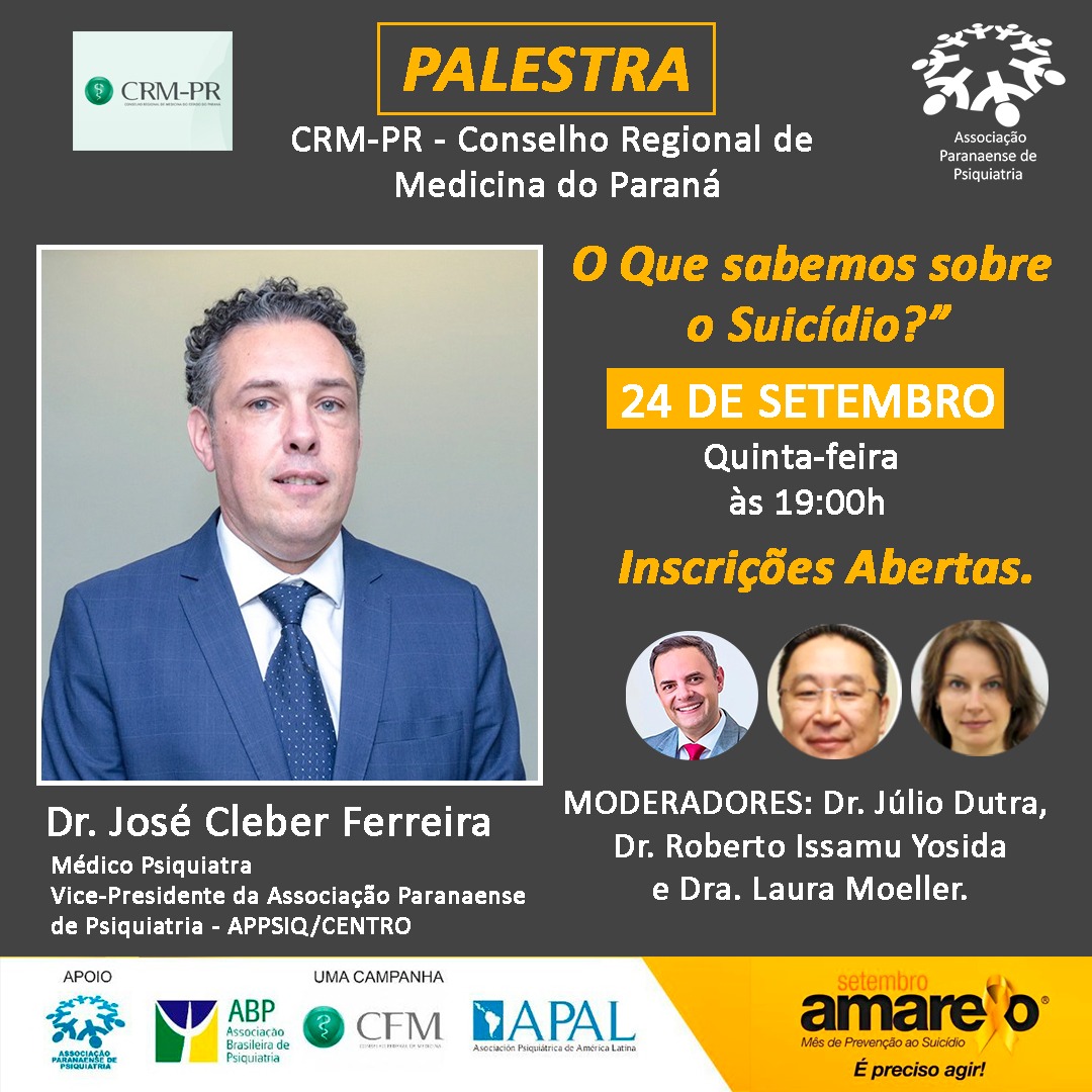 O Conselho Regional de Medicina do Paraná - CRM-PR em parceria com a Associação Paranaense de Psiquiatria - APPSIQ, convida VOCÊ para participar amanhã 24/09 (quinta-feira) às 19h, da palestra online com o tema: “O que sabemos sobre o Suicídio?"