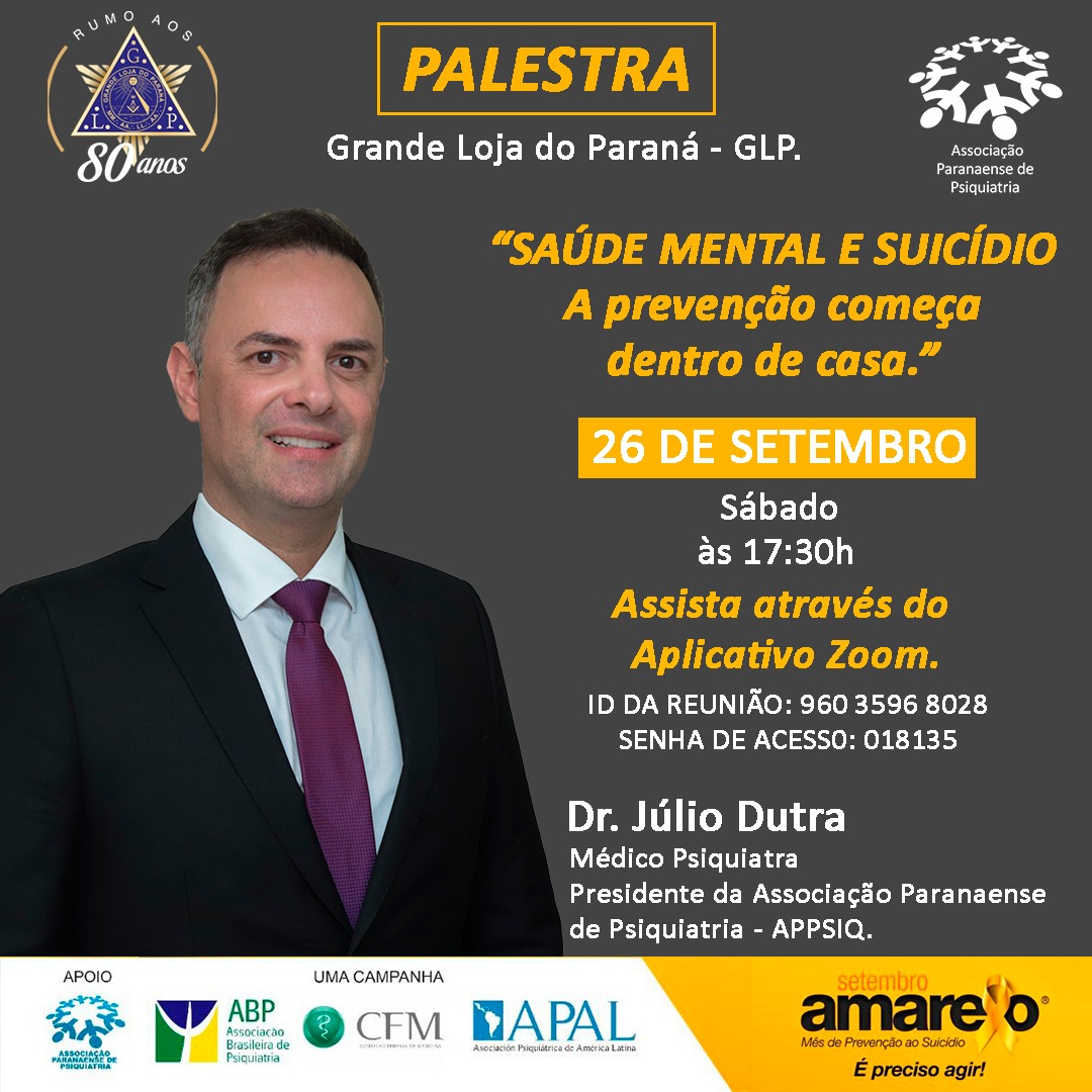 A Associação Paranaense de Psiquiatria - APPSIQ, em parceria com a Grande Loja do Paraná - GLP, realizará HOJE 26/09 às 17h30, palestra online com o tema: