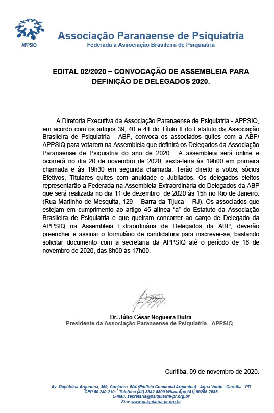EDITAL 02/2020 - Convocação de assembleia para definição de delegados 2020