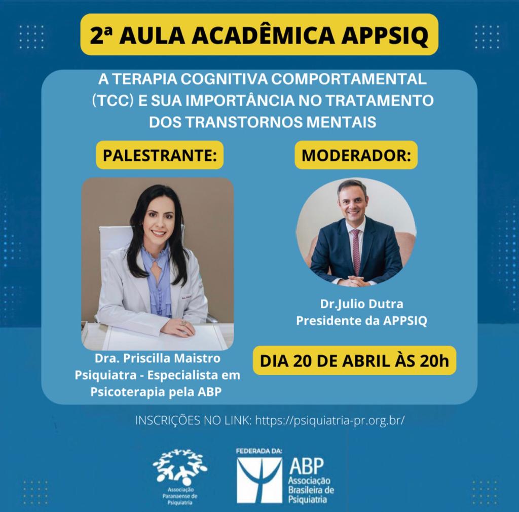“A TERAPIA COGNITIVA COMPORTAMENTAL (TCC) E SUA IMPORTÂNCIA NO TRATAMENTO DOS TRANSTORNOS MENTAIS” a aula será ministrada pela renomada Médica Psiquiatra Terapeuta Cognitivo Comportamental Dra. Priscilla Maistro.