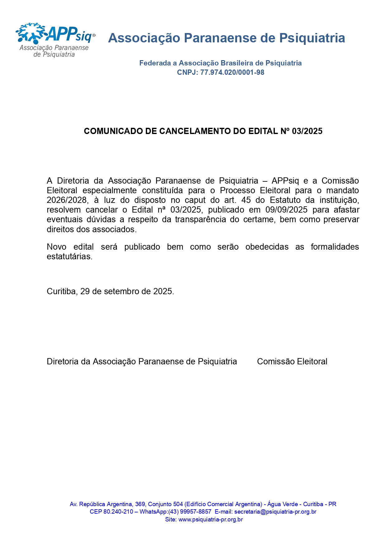 COMUNICADO DE CANCELAMENTO DO EDITAL 03/2025